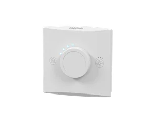 E123 is a simple room unit designed to be used with the C221/C222 control units. It has a built in temperature sensor, a set point knob and a button for timer functions. The indicator lights indicate the current function (red (heating), blue (cooling), off (dead zone)) and current fan speed.